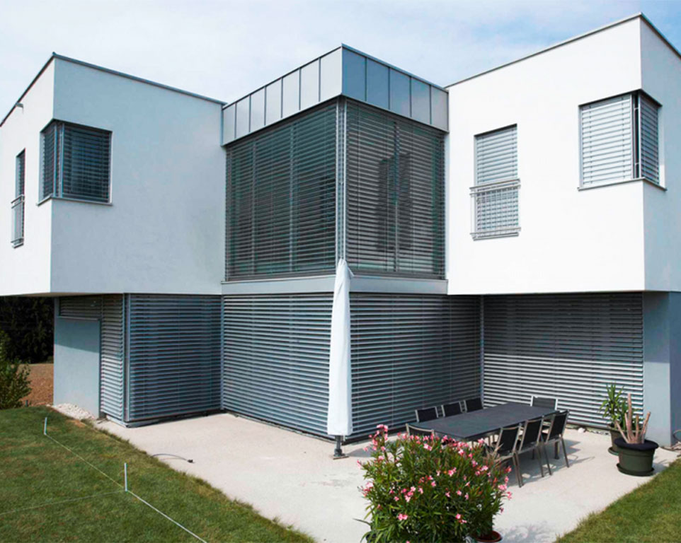 Blenden und U-Kanäle schützen Raffstores und Jalousien vor Wind und Wetter und fügen sich mit unterschiedlichen Formen und Varianten in die Gestaltung der Fassade ein.