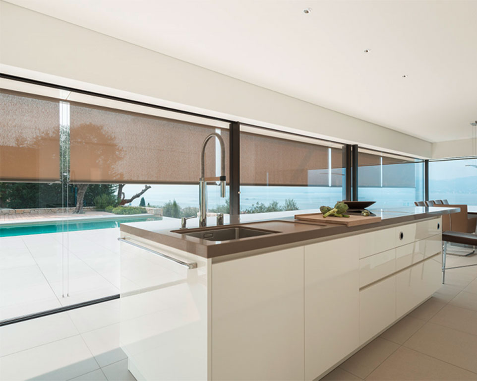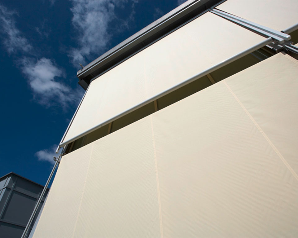 Senkrechtmarkisen funktionieren wie eine zweite Gebäudehaut und können beinahe unsichtbar montiert werden.